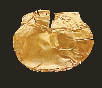 金覆面出土于河南郑州商都书院街墓地。该墓地位于郑州商都内城东南,由兆沟、通道、墓葬、祭祀遗存等组成,墓地结构布局清晰,年代明确,展示了中商早期高等级贵族丧葬礼制的规范,这是中央王朝都城内迄今所见年代最早的具有兆域性质的高等级贵族墓地,凸显诸多礼制性的制度创新,也填补了商代青铜文化、黄金文化等相关文化空白。