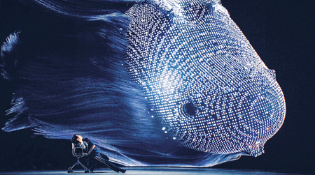 显而易见,创作这样一部视觉设计统领下的“融媒体舞剧”,主创不是“为视觉而视觉”“为融媒体而融媒体”的。那么为的是什么呢?当然是题材表现的内在诉求。这使笔者想起了一段往事:2020年11月10日北京时间上午9点整,中央电视台新闻频道,迅疾而清晰地叠映出一幅幅深渊大洋、科学考察船、水下潜水器的画面……随着叠映的画面,屏幕上出现一行醒目而振奋人心的标题:中国“奋斗者”号载人潜水器万米级试验。主播劳春燕音色激越地播报:“今天我们将共同见证:中国深潜事业乘风破浪的又一个高光时刻——中国‘奋斗者’号载人潜水器万米级海试成功坐底‘马沟’……”这个“马沟”就是位于西太平洋的马里亚纳海沟,深达11034米(我国载人潜水器的坐底处深10909米);坐底“马沟”意味着抵达了人类能够达到的地球最深点。对于我国载人深潜事业和这一高光时刻,习近平总书记致“奋斗者”号全海深载人潜水器成功完成万米海试并胜利返航的贺信中写道:“‘奋斗者’号研制及海试的成功,标志着我国具有了进入世界海洋最深处开展科学探索和研究的能力,体现了我国在海洋高技术领域的综合实力。从‘蛟龙’号、‘深海勇士’号到今天的‘奋斗者’号,你们以严谨科学的态度和自立自强的勇气,践行‘严谨求实、团结协作、拼搏奉献、勇攀高峰’的中国载人深潜精神,为科技创新树立了典范。”我们知道,负责“奋斗者”号研制及海试的核心团队,正是坐落在无锡太湖之滨的中国船舶科学研究中心(702所);无锡市歌舞剧院认为自己有责任有义务,通过对我国载人潜水器科学探索的艺术表现,通过对我国深潜团队、特别是对领军人物的性格刻画,彰显这种为科技创新树立了典范的“中国载人深潜精神”。