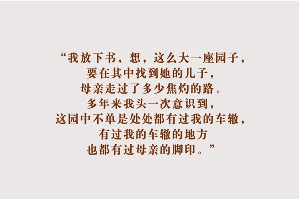 他20岁时遭受病痛,“经常是发了疯一样地离开家,从那园子里回来又中了魔似的什么话都不说。”直到母亲猝然离世,他才意识到“当我不在家里的那些漫长的时间,她是怎样心神不定坐卧难宁,兼着痛苦与惊恐与一个母亲最低限度的祈求。”才意识到“儿子的不幸在母亲那儿总是要加倍的。”也终于看到重叠在他的车辙上的“茫然又急迫”的母亲的脚印。