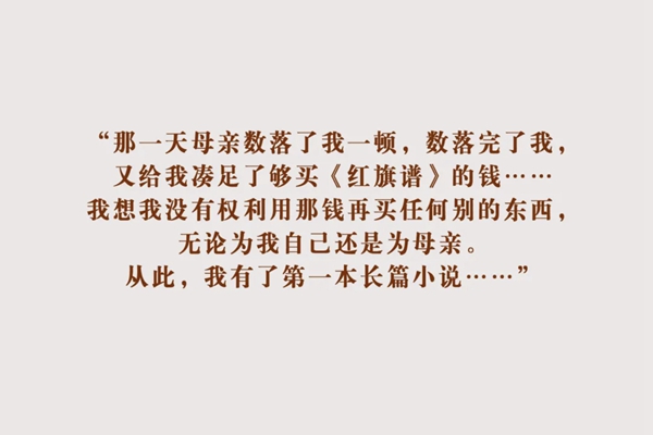文中讲述了母亲在极其艰难的生活条件下,省吃俭用,支持和鼓励梁晓声读课外书的往事。他想要读《红旗谱》,价格一元五角,于是鼓起勇气到工厂找母亲要钱买书。母亲艰苦昏暗的工作环境对他幼小的心灵造成了冲击:“那时刻我努力要回忆起一个年轻的母亲的形象,竟回忆不起母亲她何时年轻过。”最终决定用钱给辛劳的母亲买水果罐头而非课外书,但他最终也拥有了人生中的“第一本长篇小说”。