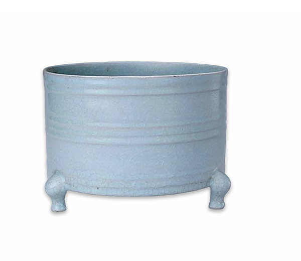 樽高12.9厘米,口径18厘米,足径17.8厘米。樽直口、圆筒腹、平底,由三个变形兽足支撑。樽外壁上中下凸起七道弦纹,中部三道,近口及底部各有两道。器物制作庄重古朴,气韵高雅,上中下三层七道弦纹,更增加了三足樽庄重肃穆之感。胎质细腻,呈香灰色,胎体较轻。里外满釉,呈天青色微泛蓝,并有细小浅白的开片,俗称冰裂片。色质柔和莹润,造型完美和谐,代表了千年国宝汝窑瓷的最高水平。