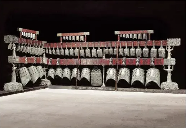 曾侯乙编钟1978年出土于湖北随州曾侯乙墓,年代为战国早期,现收藏于湖北博物馆。钟架长7.48米、高2.65米。全套编钟共六十五件,分三层八组悬挂在呈曲尺形的铜木结构钟架上,上层为三组共19件钮钟、中下层五组共45件甬钟,及一件楚惠王赠送给曾侯乙的镈钟所组成。钟及架、钩上共有铭文3755字,内容为编号、记事、标音及乐律理论。每件钟均能奏出呈三度音程的双音,整套编钟音域可跨五个半八度,中心音区十二个半音齐备,能演奏五声、六声或七声音阶的乐曲。