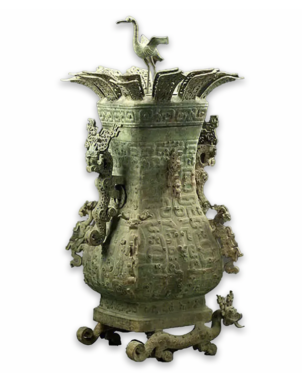 春秋莲鹤方壶,春秋中期青铜制盛酒或盛水器,中国首批禁止出国(境)展览文物。1923年出土于河南新郑李家楼郑公大墓,一件收藏于北京故宫博物院青铜馆,一件收藏于河南博物院。