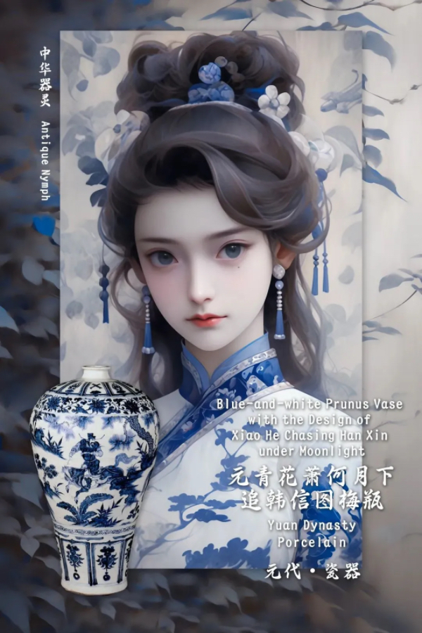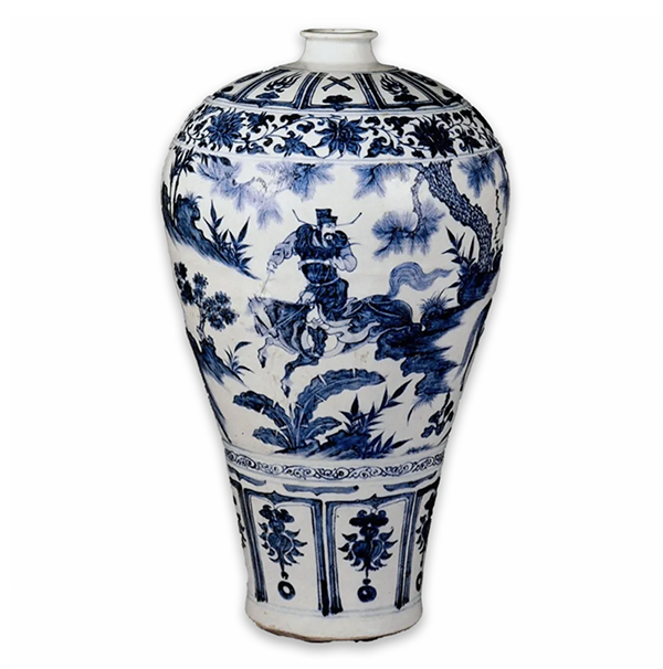元青花萧何月下追韩信图梅瓶是元末明初青花瓷中的罕见珍品,为国宝级文物,是南京市博物馆的“镇馆之宝”,中国瓷器三绝之一。2013年8月19日,国家文物局将其列入《第三批禁止出国(境)展览文物》。