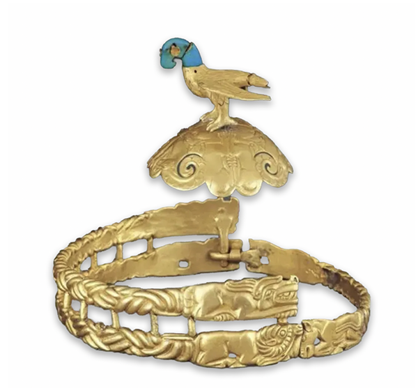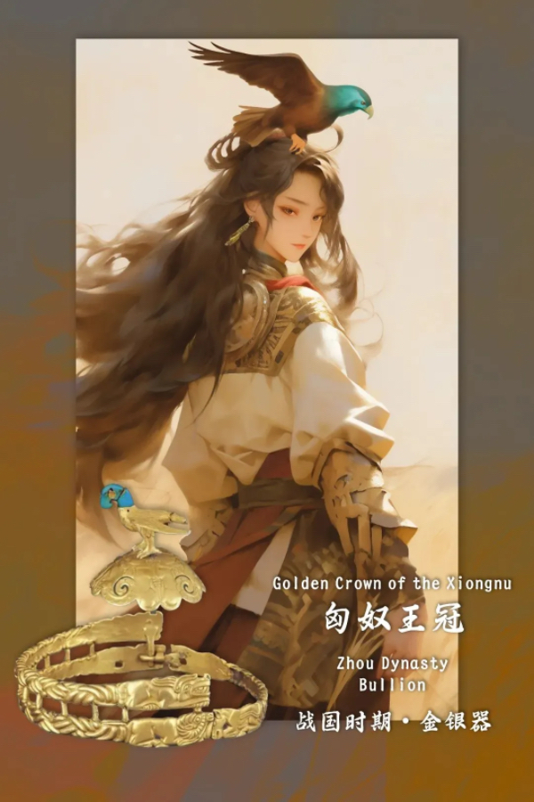 匈奴王冠,国家一级文物。通高7.3厘米、带长30厘米、重1394克,由黄金铸成。金冠分为冠顶和冠带。冠饰呈半球体,其上浮雕四只狼和四只盘角羊组成的咬斗图案。在半球体的冠顶上立一展翅欲飞的雄鹰,做俯视状。整个冠饰构成了雄鹰俯视狼羊咬斗的画面。上有浮雕卧虎、卧式盘角羊和卧马造型,中间部分为绳索纹。