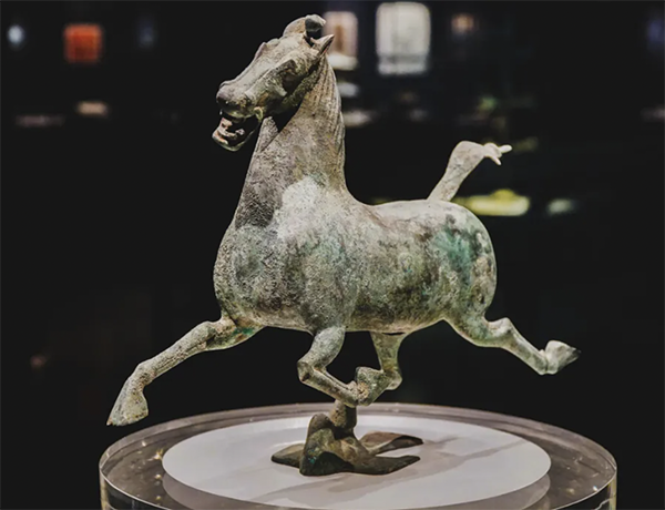 铜奔马,又名“马踏飞燕”、“马超龙雀”等,为东汉青铜器。1969年10月出土于甘肃省武威市雷台汉墓,1983年10月,被国家旅游局确定为中国旅游标志,1986年定为国宝级文物,现藏于甘肃省博物馆,为甘肃省博物馆镇馆之宝。马高34.5厘米、长44.5厘米、宽10厘米、重7.15公斤。其铸造工艺为范铸马身,然后再与马尾、马腿、蹄下飞鸟等部件分别铸合制作而成,铜腿内夹有铁芯以增强支撑力和强度,铸造工艺在当时非常先进。