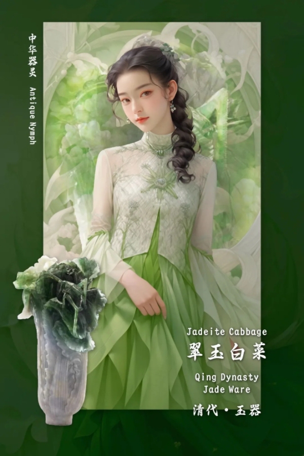 翠玉白菜是由翠玉所琢碾出白菜形状的清代文物,是台北故宫博物院的镇馆三宝之一。该文物长18.7厘米,宽9.1厘米,厚5.0厘米,菜身洁白而叶子翠绿,菜叶上停留的两只昆虫是寓意多子多孙的螽斯和蝗虫。蝗虫与螽斯的每一根触角都清晰可见,每一处都彰显其制作者的精湛技艺。