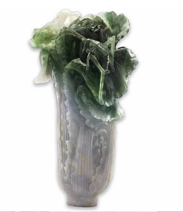 此件翠玉白菜原是紫禁城永和宫的陈设器,永和宫为清末瑾妃所居之宫殿,据说翠玉白菜即为其随嫁的嫁妆。白菜寓意清白,象征新嫁娘的纯洁。昆虫则象征多产,祈愿新妇能子孙众多。自然色泽、人为形制、象征意念,三者搭配和谐,遂成就出一件不可多得的珍品。