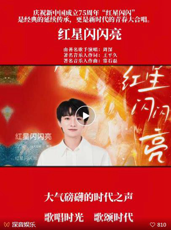 庆祝新中国成立75周年之际,由青年歌手周深演唱,著名音乐人王平久作词、常石磊作曲的《红星闪闪亮》正式发布。生在红旗下,青年蓬勃昂扬、意气风发,青春的光芒闪亮在伟大的时代!