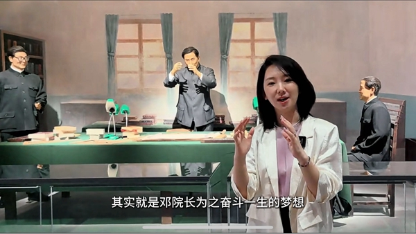 这个场景是模拟邓稼先院长与工作人员开会的场景,这个手势也是邓院长的经典动作,意思是如果原子弹有篮球那么大就好了,这也是他为之奋斗一生的目标。邓稼先1948年赴美国留学,他仅仅用一年零十一个月就获得了博士学位,在拿到学位的第9天,他便与百余名爱国青年一道乘船回国,投身新中国建设。1958年,钱三强找他谈话,神秘地说“我们要放个大炮仗”,邓稼先心领神会。加入这项计划,就意味着隐姓埋名,不能向家人透露自己的工作,不能发表学术成果,谢绝一切公开名利。邓稼先从此开始长达28年的隐姓埋名,其中有14年的时间都是在梓潼“两弹城”度过的。