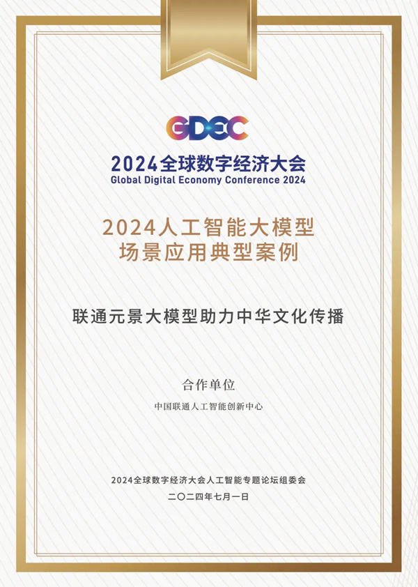由中国外文局文化传播中心、中国文艺网、中国联通人工智能创新中心、上海沃橙信息技术有限公司基于联通元景大模型联合打造的“中华器灵”创作平台,凭借其创新性与独特的文化价值,作为“联通元景大模型助力中华文化传播”案例,成功入选典型案例。