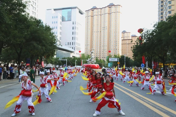 延安市安塞区第一小学的“鼓娃”们在街头表演安塞腰鼓