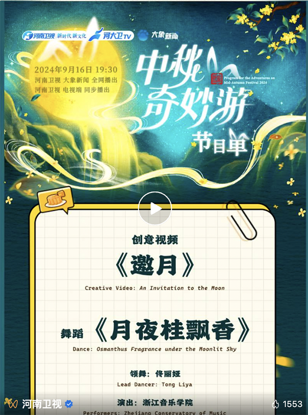 《2024中秋奇妙游》以“月”为引,延续“中国节日”系列表现形式,以邀月、沐月、圆月等章节,从追月寄情,到待月赏景,再到月圆如愿,开启一场融通古今的视听奇妙之旅。