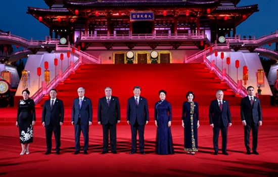 2023年5月18日晚,国家主席习近平和夫人彭丽媛在陕西省西安市大唐芙蓉园为出席中国-中亚峰会的中亚国家元首夫妇举行欢迎仪式和欢迎宴会。宴会后,习近平夫妇同贵宾们共同观看中国同中亚国家人民文化艺术年暨中国-中亚青年艺术节开幕式演出。这是习近平夫妇在紫云楼前同贵宾合影留念。新华社记者 丁海涛 摄