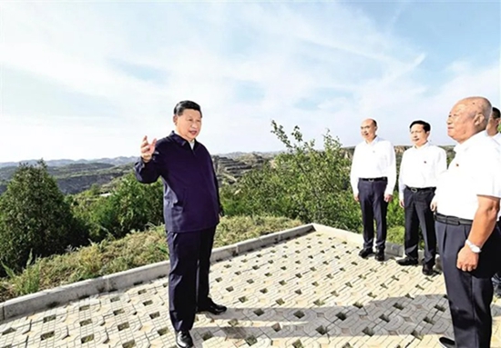 2021年9月13日至14日,中共中央总书记、国家主席、中央军委主席习近平在陕西省榆林市考察。这是13日下午,习近平在米脂县银州街道高西沟村龙头山山顶,考察黄土丘陵沟壑区综合治理情况。新华社记者 谢环驰 摄