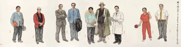 2009年,新中国成立60周年纪念日前夕,中华全国总工会开展了“时代领跑者——新中国成立以来最具影响的劳动模范”评选活动,评选产生出60位“时代领跑者”。文艺工作者要为人民抒写、为人民抒情、为人民抒怀,吴宪生、韩京雷、李鹏与吴冠华的这件长卷选取其中9位时代楷模,分别代表了不同时代和不同领域。