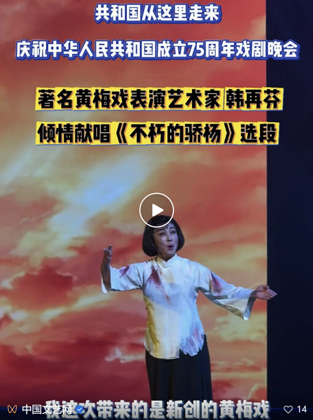黄梅戏表演艺术家韩再芬通过革命题材,将革命精神深刻融入她的戏曲创作。9月27日,在“共和国从这里走来——庆祝中华人民共和国成立75周年戏剧晚会”演出中,韩再芬倾情献唱黄梅戏《不朽的骄阳》,以独特的艺术形式生动演绎了革命烈士杨开慧的坚韧与无畏,展现了革命者面对困境时的信念和力量。她认为,只有深入理解杨开慧的精神信仰与内心力量,才能让角色更加饱满真实。她提到:“杨开慧的信仰与爱情是我创作的核心,通过黄梅戏这种形式,不仅是在还原历史,更是在传承革命精神,并赋予它新的时代意义。”