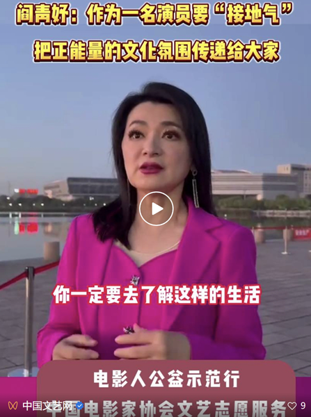 9月21日至23日,阎青妤参加了“电影人公益示范行——中国影协文艺志愿服务走进辽宁阜新”活动,与田英男共同演绎了经典歌曲《九九艳阳天》。她用真挚的情感传递了人民对美好生活的向往,展现了演员通过艺术与观众共鸣的力量。阎青妤坚信:“无论何种艺术形式,只有真正融入生活,才能触动人心。”正是通过深入生活,她将角色的情感表现得真实、动人,赋予了角色灵魂。