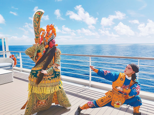 按照计划,两场折子戏演出在邮轮启动后就要开始。10月1日下午4点多邮轮离港时,10层海滩广场将上演优秀青年演员张亚鸽的《穆桂英挂帅》和曹会芳的《花木兰》选段,另外还有美猴王、关公等戏曲人物要在广场亮相。但是由于“花木兰”的行李没能及时拿到,原来只准备在台下活跃气氛的美猴王被请到台上临时加演猴戏,这才化解了刚登船就遇到的一次小危机。