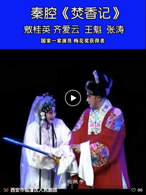 齐爱云饰演角色为秦腔《焚香记》中的敫桂英。《焚香记》的故事自宋代起就在民间广泛流传,各大剧种都有相关剧目呈现。其中秦腔《焚香记》是以《王魁负义》的本戏为基调,吸收借鉴不同剧种之所长编排而成,独具特色。