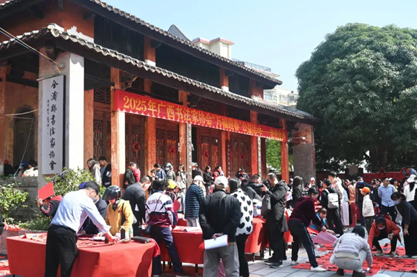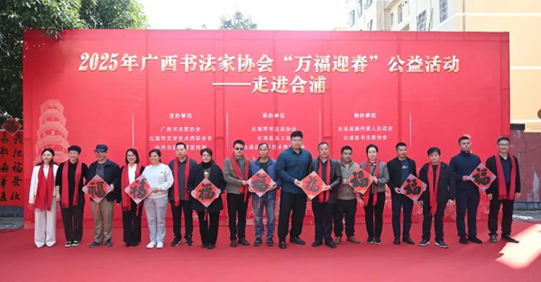 1月4日,广西书协2025年“万福迎春”公益活动——走进合浦,在北海市合浦县开展。活动现场节日气氛浓郁热烈,书法家们挥毫泼墨,一副副寓意吉祥的春联和“福”字跃然纸上,篆、隶、草、行、楷等多种字体各显神韵,不同的书体风格传递着人们对美好生活的憧憬,真挚的祝福溢于字里行间,为即将到来的蛇年春节增添了喜气。