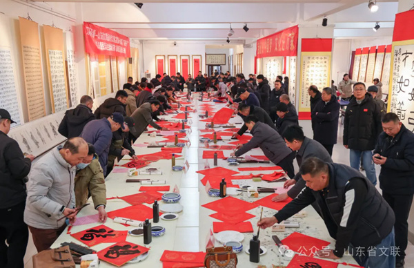 1月7日,万福迎春——山东省文联新时代文明实践第十四届“百县千村”书法惠民活动在全省16市及所属县(市、区)同步启动,启动仪式在济南、临沂分别举办。活动现场,书法家饱含热情、展纸挥毫,为当地居民创作了春联、“福”字等书法作品近3000件,为腊八节增添了浓浓的节日气氛,受到群众们热烈欢迎。