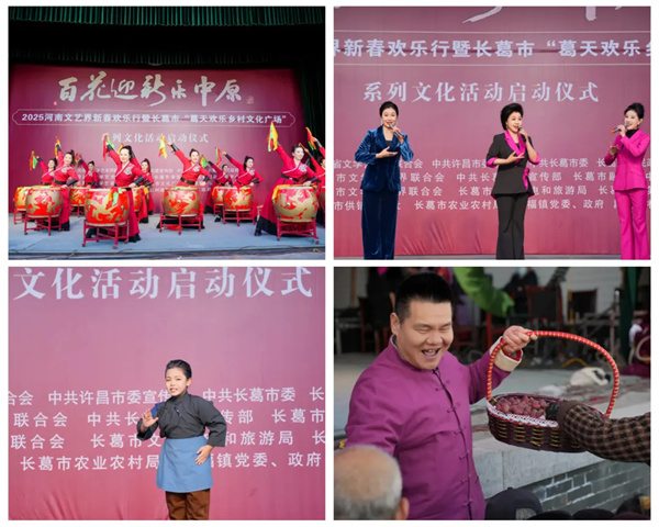1月7日,农历腊月初八,由河南省文联等主办的“百花迎新乐中原——2025河南文艺界新春欢乐行”系列活动主会场启动仪式在长葛市段黄庄社区举行。本次活动采取“1+7”模式,郑州分会场、洛阳分会场、安阳分会场、焦作分会场、漯河分会场、周口分会场、信阳分会场,同一时间同步进行。 活动在舞蹈《鼓韵神舟》中拉开帷幕。曲艺节目喷空《我是俺村代言人》接地气、冒热气;第三代“银环”扮演者、豫剧名家杨红霞携弟子表演的经典现代戏《朝阳沟》选段引得观众纷纷跟唱;魔术表演《魔力四射——福乐汇》令观众惊叹。舞台一侧,河南省书协组织书法家开笔迎新;另一侧,河南省民协组织非遗传承人现场展示十余项民间工艺绝活,手把手向群众传授技艺。