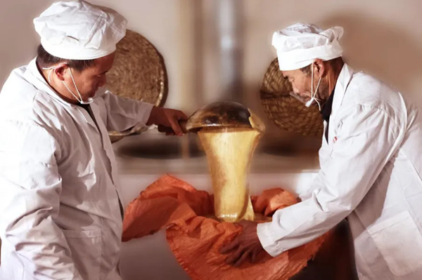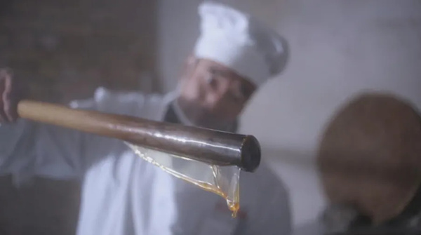 每天清晨,天还未亮,张克明一家人就起床开始制作糖瓜了。做糖瓜的第一步要先发麦芽,麦芽发好以后,把浸泡的小米放到锅里蒸熟。接下来就是将蒸熟的小米与麦芽混合在一起搅匀,放入发酵缸内,用一定温度发酵六个小时左右。从发酵缸里流出来的就是糖浆。然后,将流下来的糖浆放到锅里熬,一般熬三四个小时,就可以炒糖了。 炒糖时,一开始先用棍搅,搅不动以后用木铲铲,直到炒出一些大凝泡以后,这糖就算炒好了。等糖冷却到一定程度,就可以制作糖瓜了。制作糖瓜时,要防止糖在低温下变硬。所以要直接在锅上利用热气扯糖,借着水汽的滋润,锅前的张克明父子将熬好的糖拿出一块,挂在木钩上,开始用手拉扯,焦黄的麦芽糖随着水蒸气不断的熏蒸,在连续拉扯几十次后变得松软而洁白。