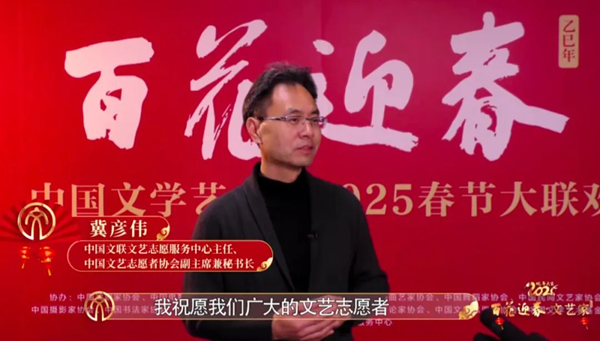 中国文联文艺志愿服务中心主任冀彦伟,希望通过“百花迎春”给大家带来艺术的温度和思想的深度,也希望大家能通过这个舞台,感受到祖国发展的越来越好。祝愿广大的文艺工作者们不忘初心砥砺前行,在我们前进的道路上,用我们的努力和智慧,去创作更多时代需要、人民需要、国家需要的精品力作。在中华文化里,蛇是灵性、智慧和生命力的象征,寓意着丰收、吉祥和福瑞。乙巳蛇年,文艺工作者将以蛇行千里的劲头,坚定信心、满怀希望,开拓进取、顽强奋斗,共同书写中国式现代化新篇章。