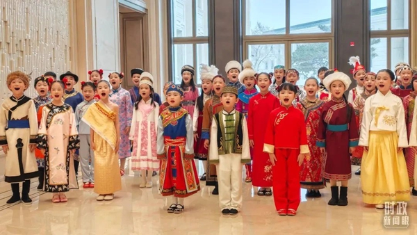 欢迎宴会现场,少年儿童正在合唱黑龙江民歌《乌苏里船歌》。总台央视记者 闫耀东 摄