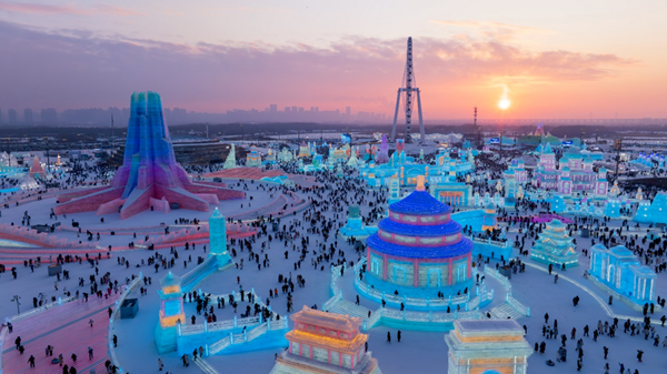 在哈尔滨冰雪大世界,中国天坛祈年殿、泰国曼谷大皇宫、阿联酋迪拜哈利法塔等亚洲地标冰雕晶莹剔透,吸引大量中外游客前来一站式“打卡”。哈尔滨冰雪大世界股份有限公司市场营销部副部长孙泽旻表示,冰雪大世界今年的设计和建设充分融入传统文化、亚冬会元素和冰城特色。“我们将按照习近平主席的要求,继续吸收更多中外文化灵感用于冰雪文化展示和传播,促进各国文化交融相亲。”