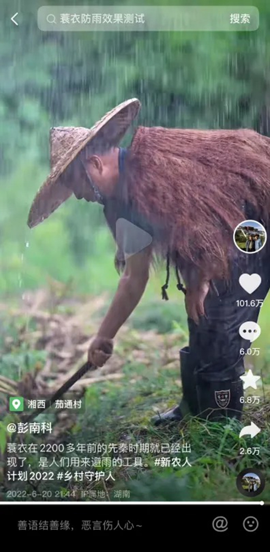 当过16年摄影记者的彭南科,“半路出家”在短视频里“复活”了众多非遗农耕用具。创作画面精致考究,在湘西如世外桃源般的天然布景下,帧帧画面更是美不胜收。彭南科视频里的非遗用具通常工序繁琐,需要安静的场景与心境,以慢工、细活的方式进行制作,让人忍不住安下心来静静观赏,沉浸在精细的画面与舒适的配乐里,获得难得的精神放松,众多“90后”“00后”也为其所吸引。古老而低调的非遗文化与农耕技艺,与年轻的抖音短视频碰撞出绚丽火花,绽放出了新的生机与活力,吸引了成千上万网友的观看和点赞。