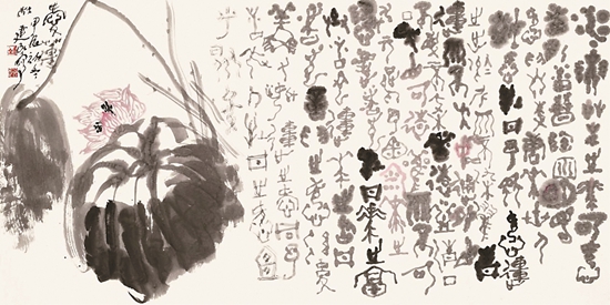 无论是书法还是绘画,其核心都在于笔墨。欣赏杜建民的《此君淡若》《不可一日无竹》《山中塘伴灯心》等作品,我们能看到他虽然传承了传统文人画脉络,但明显与文人画秀美空灵的笔墨拉开了距离。如在《爱莲说》等作品中,杜建民创造性地将写意甲骨与诗、画、印相结合,这种新形式的探索深入挖掘了传统笔墨形态,拓宽了笔墨语言的表现力,在继承传统的基础上创造出了属于自己的独特风格。