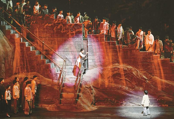 7月21日晚,19个国家和中国港澳台地区的26家华文媒体来到位于重庆市沙坪坝区的重庆1949大剧院,欣赏大型红色舞台剧《重庆·1949》,感受艺术与科技融合的视听盛宴。据介绍,《重庆·1949》舞台剧以1949年重庆解放前夕为大背景,讲述了众多被关押在渣滓洞、白公馆的中国共产党人经受住种种酷刑折磨,不折不挠、宁死不屈的故事。图为演出现场。中新社记者 周毅 摄