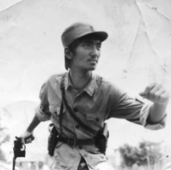 1985年吴为山身穿新四军军服,为雕塑创作摆造型。