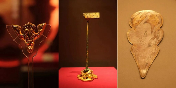 从左至右分别为凤鸟纹龙首金花饰、鎏金铜磬架、鎏金天马纹银当卢