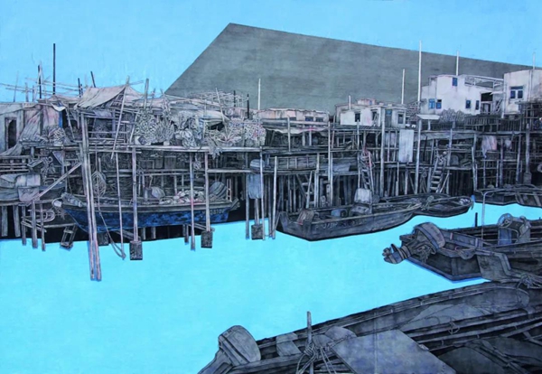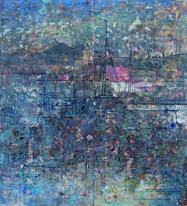 本作品采用独特的技法及材质,展现晨曦中的港口景色,表现自然光影和景色触动心灵的美感。