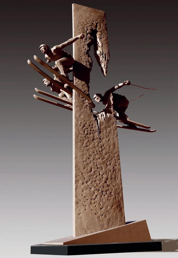 表现冬奥会滑雪运动员们一个方向、一个目标奋勇向前追逐滑行,与高耸树立,象征着雪山高原的墙体边缘交叠相连的“凝固”瞬间,是力与美的完美结合。