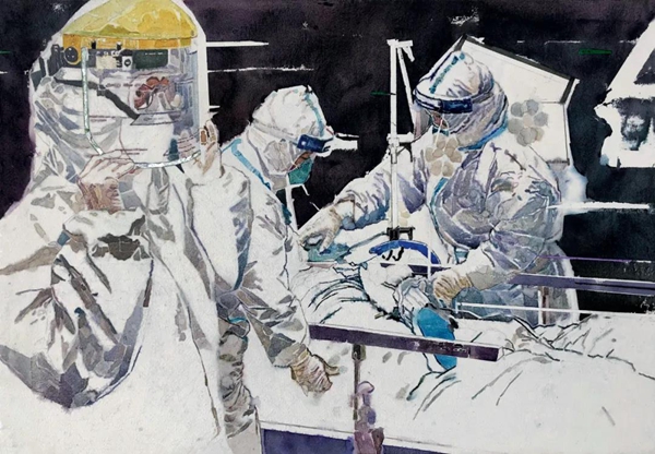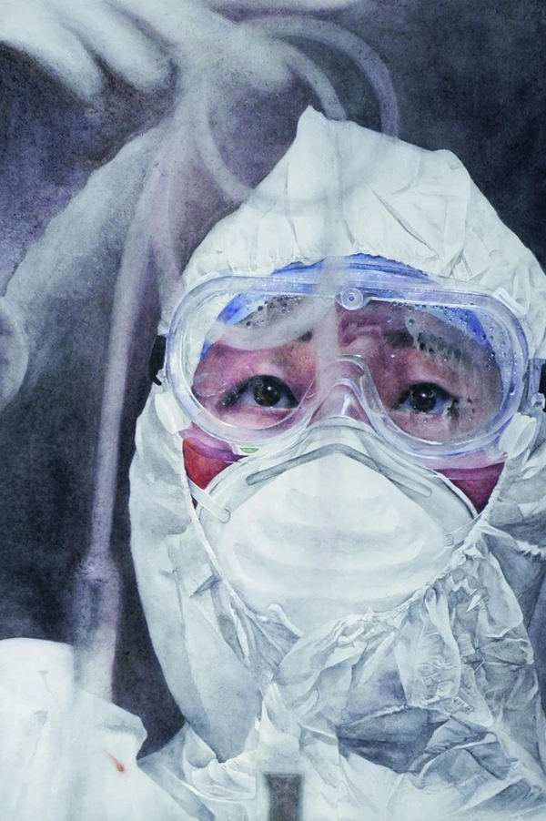 以写实手法描绘支援武汉的抗疫英雄形象,着重刻画医护人员工作时全神贯注的表情神态。护目镜上凝结的水滴描绘入微,不仅表现抗疫形势的紧张严峻,同时充分体现水彩的材质美感。