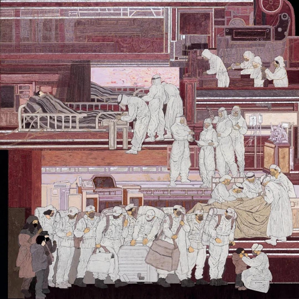 以形式化、风格化的视觉语言呈现抗疫一线医护人员救治病人的典型场景。