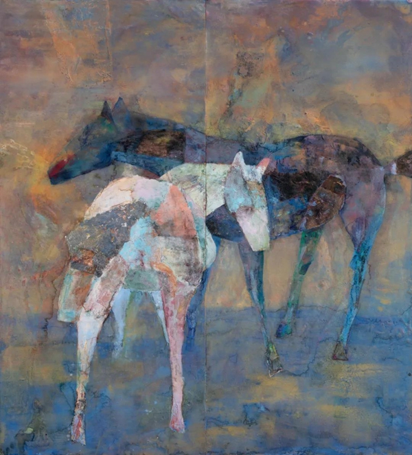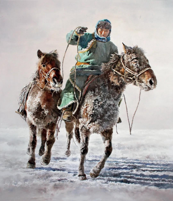 运用写实的手法,借鉴中国画的笔墨韵致,表现出草原人在莽莽草原中踏雪而行的坚毅品格和不屈精神。