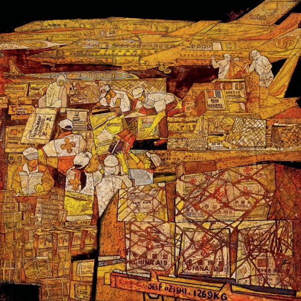 作品以抗疫物资、志愿者、医护人员和飞机为主要视觉元素,表现筹备运送“中国援助”抗疫物资的繁忙景象,展现疫情当前各国人民守望相助,共同构建人类命运共同体的强烈愿望。