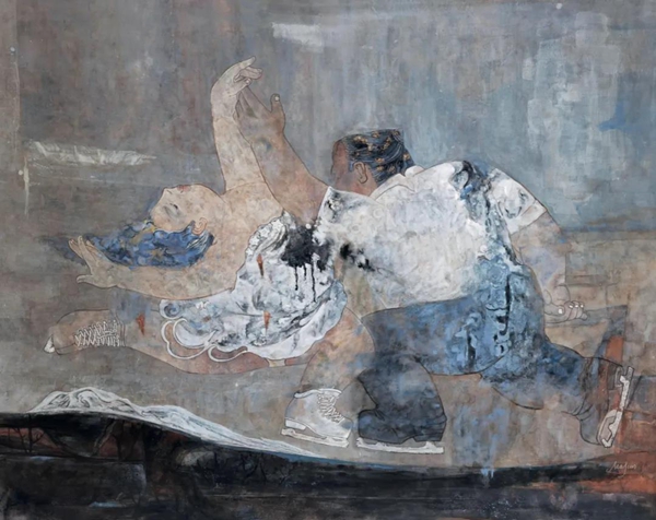 作品以夸张诙谐的人物造型表现冬奥比赛项目花样滑冰双人滑。