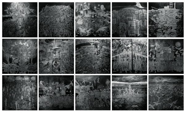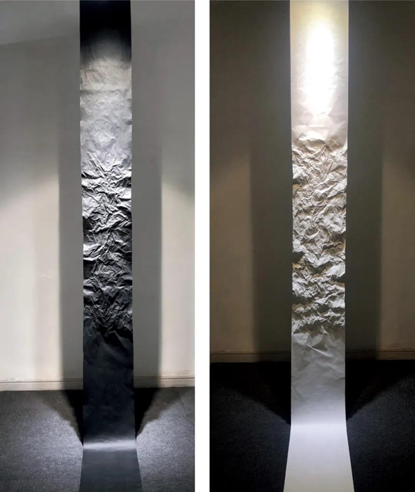 引出“画”的行为,通过“画一笔即少一笔”的刷墨行为后,另一面拓回宣纸本色,黑与白、阴与阳等,通过行为的介入让阴阳两面的长卷产生起伏、凹凸等变化,知黑守白、物我相融,这里所指的“物”,指向“物象”的各种隐喻。