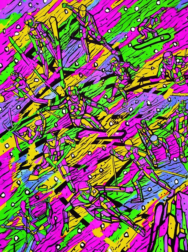 作品对冬季项目运动人物动态进行结构化处理,以热烈跃动的色彩,表达冬奥会欢乐、竞技、积极、团结的气氛。