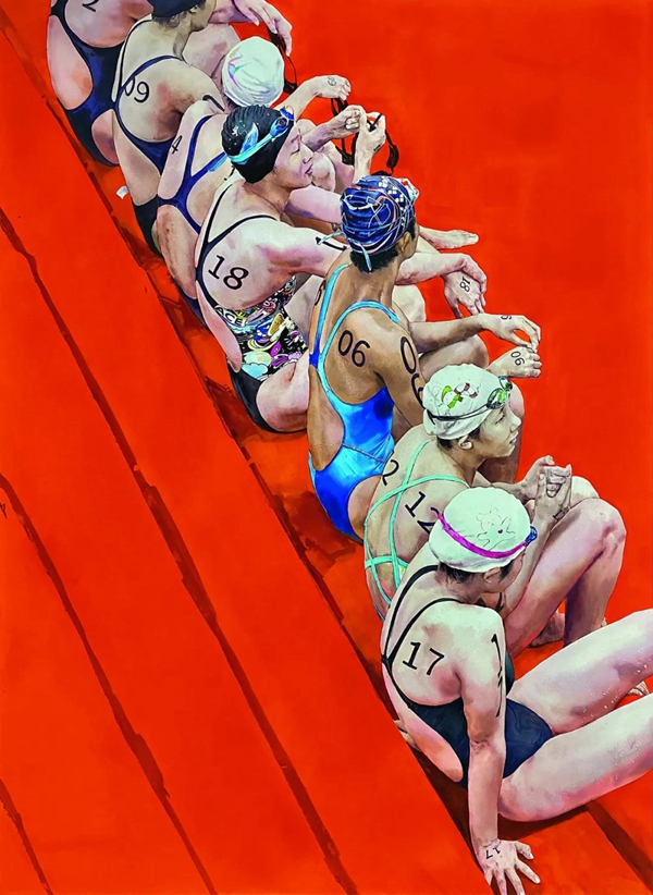 描绘武汉渡江节运动员们开赛前的准备场景,高度抽象概括的橙红色背景衬托表现运动员们勇往无前的精神。