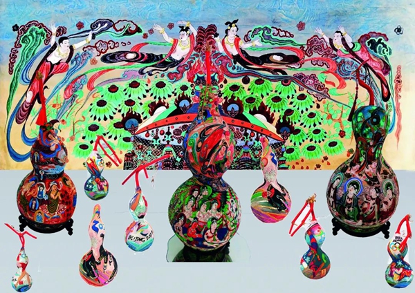 用葫芦雕刻彩绘与传统壁画结合的形式,将取自敦煌壁画的飞天、菩萨形象与冬奥体育项目并置,奥运精神与中国传统文化共同传递。