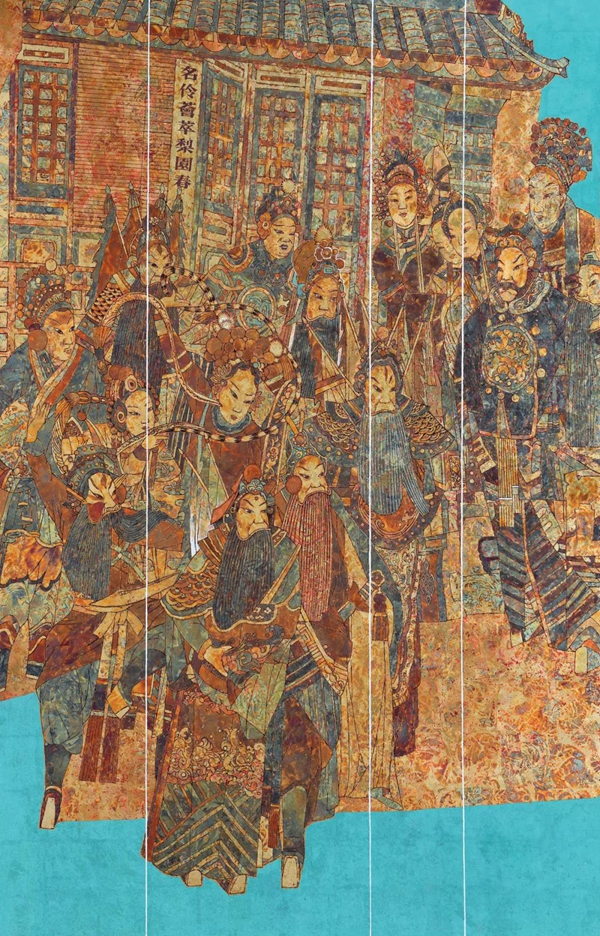 作品表现国粹京剧人物形象,采用矿物色颜料和3D纺织材料并结合烧制金属箔等特殊工艺,使画面独具材质美感。