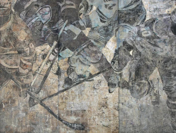 作品以别具一格的视角构图和独特的肌理效果描绘奥运冰球赛场的竞技瞬间,意图表达奥运精神带给我们的思考与启迪。