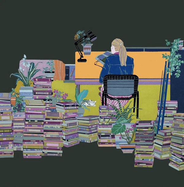 作品采用具有设计感的平面构成语言,表现当代教育工作者辛勤夜读遨游书海的场景。